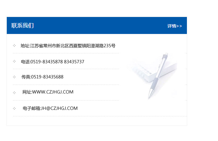 傳真:0519-83435688    郵編:213135    網址:WWW.czjhgj_com.xixilizs.com    電子郵箱:JH@czjhgj_com.xixilizs.com
